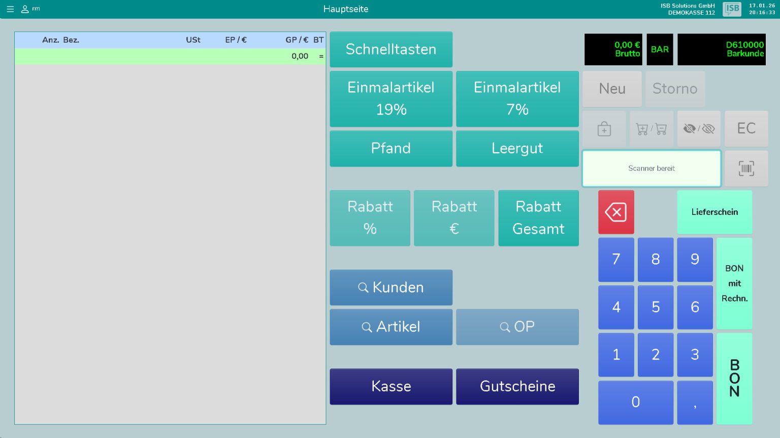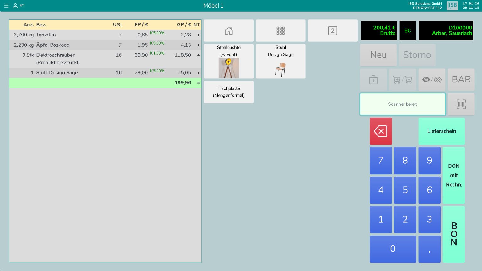 - Kundenauswahl: Standard-Barverkaufskunde oder jeder im ERP erfasste Kunde.