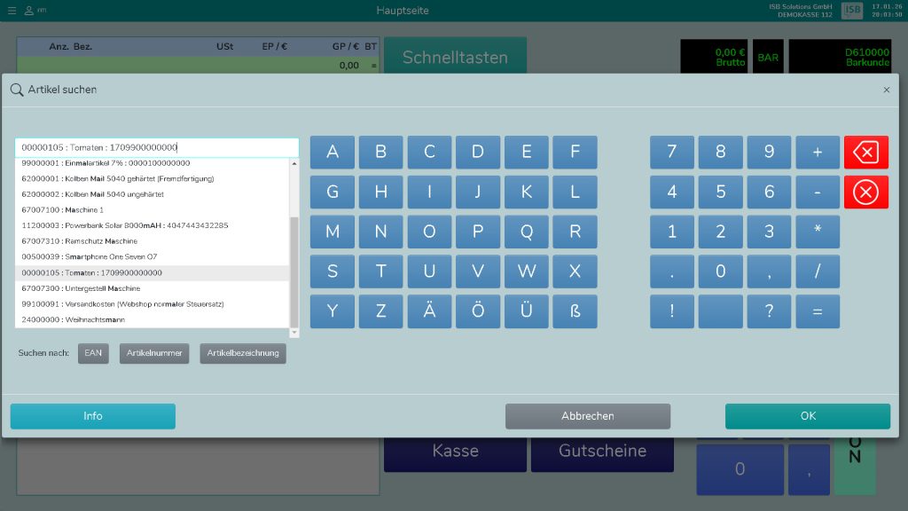 - Artikelauswahl: Aus der Warenwirtschaft mit Artikelinfos und Artikelbildern.